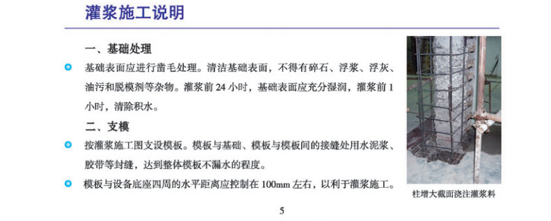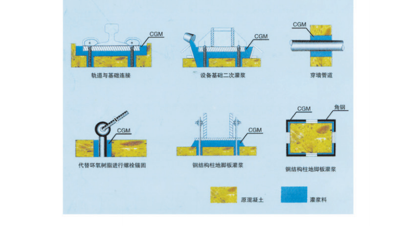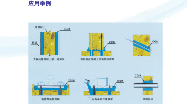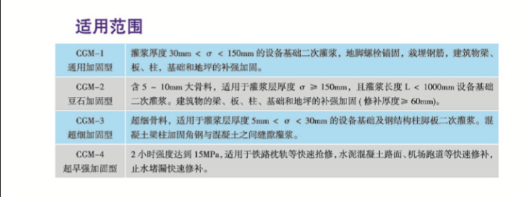 灌漿厚度30mm<δ<150mm設(shè)備基礎(chǔ)二次灌漿,地腳螺栓錨固,栽埋鋼筋,建筑物梁、板、柱、基礎(chǔ)和地坪的補強加固。
