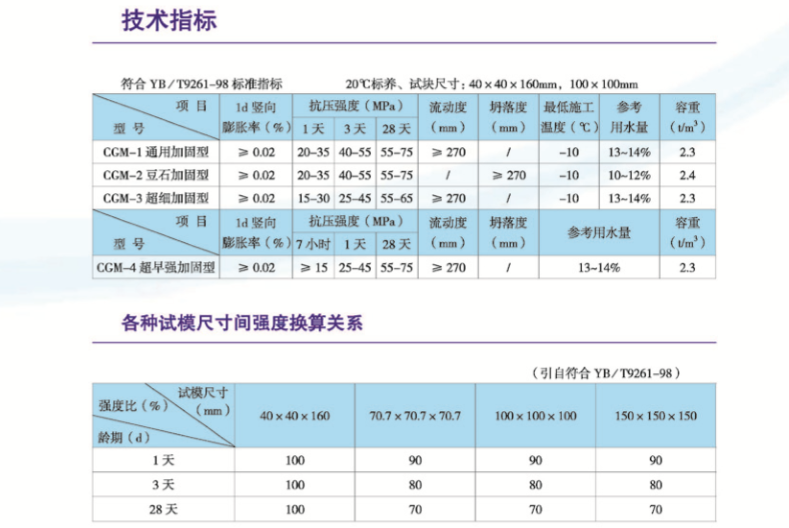 技術(shù)指標 符合YB/T9261-98標準指標 20℃標養(yǎng)、試塊尺寸:40×40×160mm,100×100mm